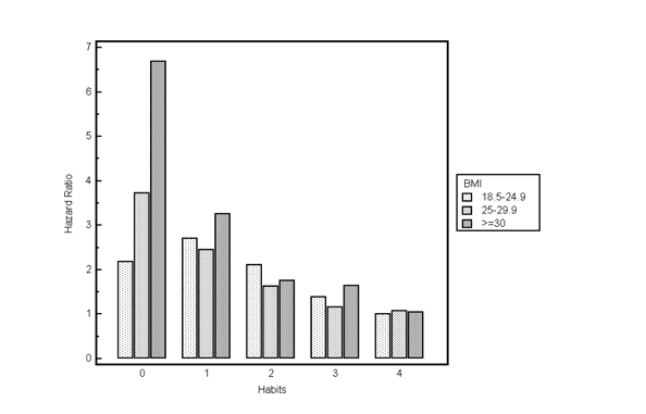 Como se puede ver en la gráfica tomada de los resultados de este estudio, cuando se presentan 3 ó 4 de estos factores protectores (dos últimos grupos de columnas), tanto el grupo de personas con normopeso (primera columna), como el grupo con sobrepeso y obesidad (segunda y tercera columna) presentan los mínimos ratios de mortalidad.